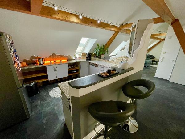 Diese schöne Wohnung mit Garten verfügt weiters über einen großen offenen Wohn-, Küchen- und Essbereich, der zusätzlich mit einem Schwedenofen beheizt werden kann.